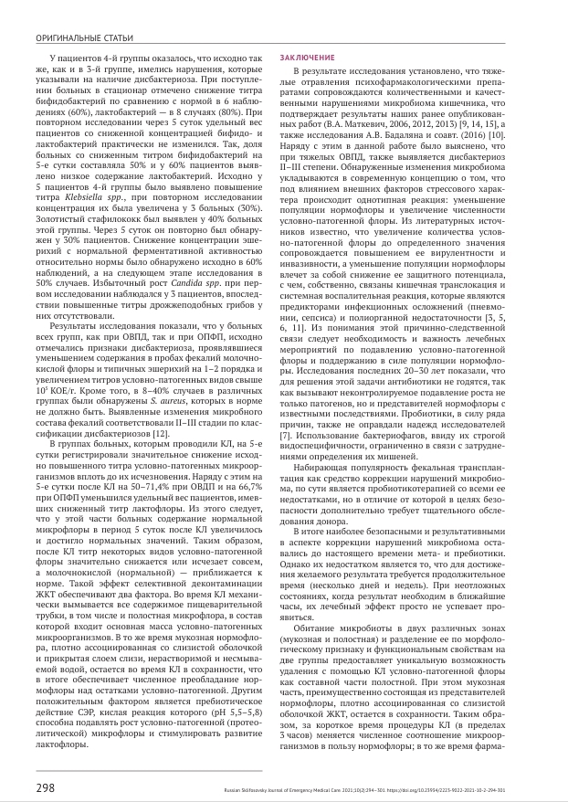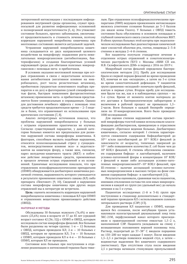 Коррекция нарушений микробиоценоза кишечника с помощью кишечного лаважа при острых отравлениях