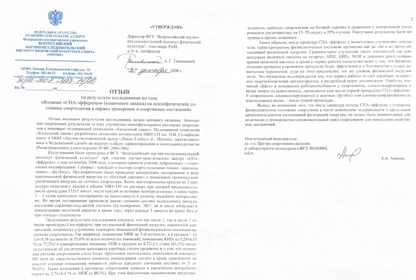 В 2008 году во Всероссийском НИИ физической культуры было проведено исследование на тему «Влияние кишечного лаважа на психофизическое состояние спортсменов в период тренировок и спортивных состязаний» (А.Г. Тоневицкий и Е.Б. Акимов, 2008). В исследованиях участвовали спортсмены футболисты, скалолазы и лыжники (квалификации – I разряд и кандидат в мастера спорта).